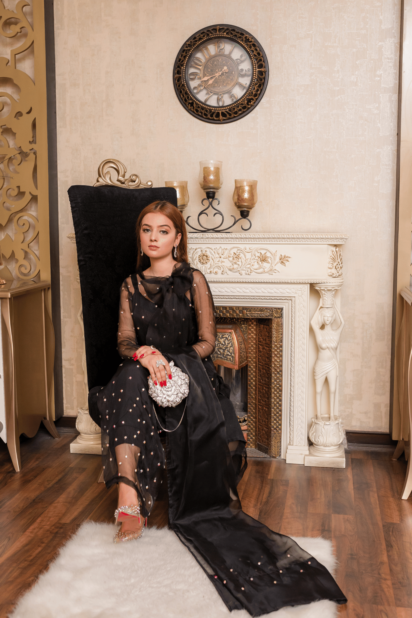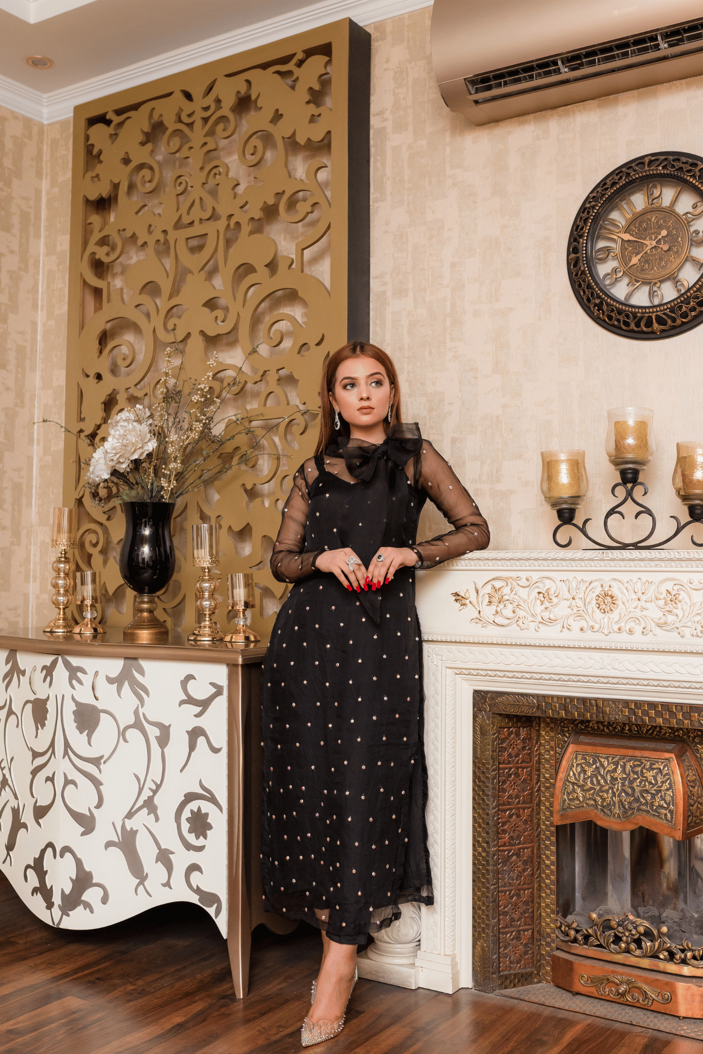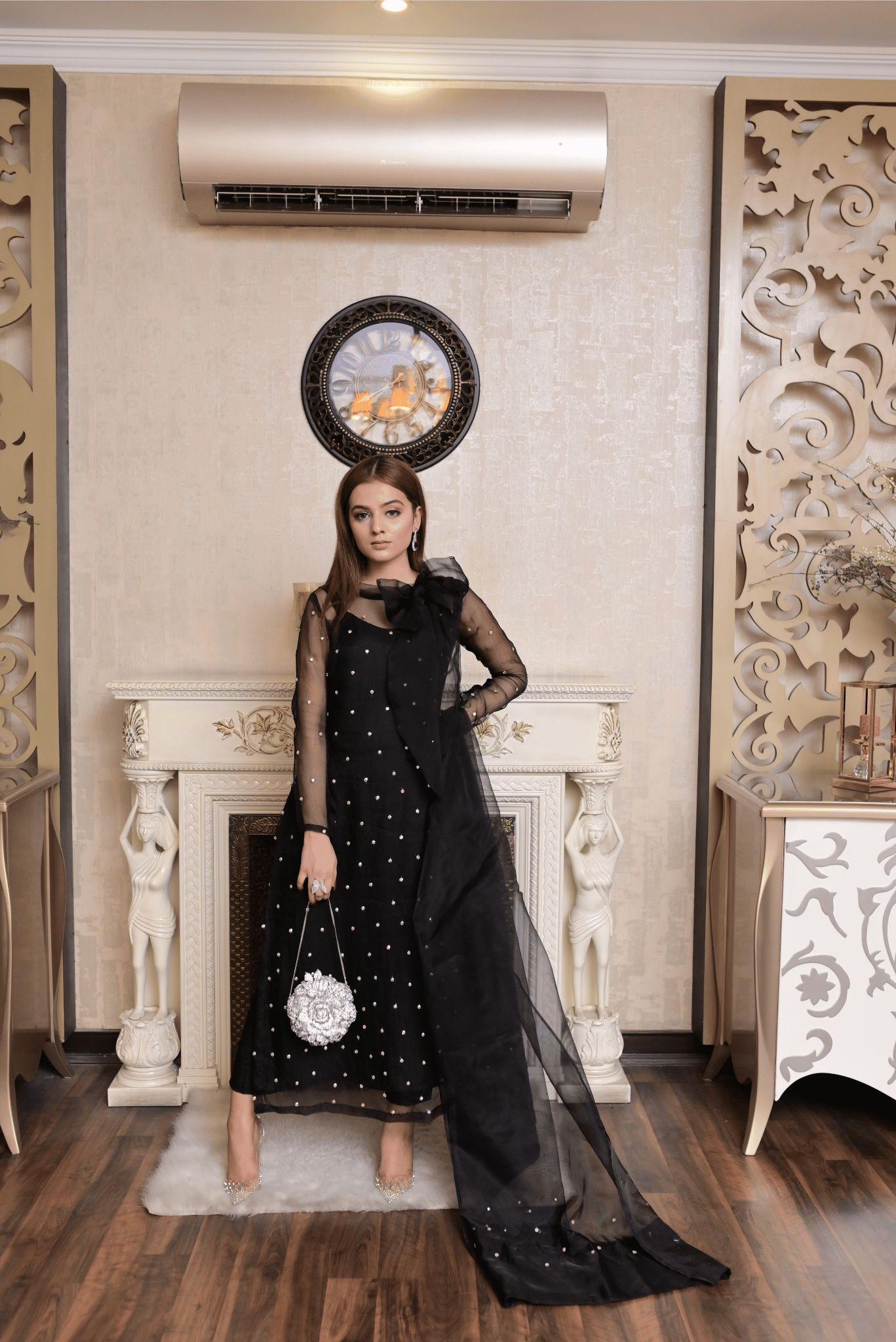 A sleek, black long shirt featuring a chic high neckline tied with an elegant bow. The entire piece is artfully adorned with a fine “spray” of muse stones, creating a subtle shimmer that dances across the fabric. Crafted for a modern yet sophisticated look, it strikes the perfect balance between bold tailoring and delicate embellishment. Made on pure organza fabric.