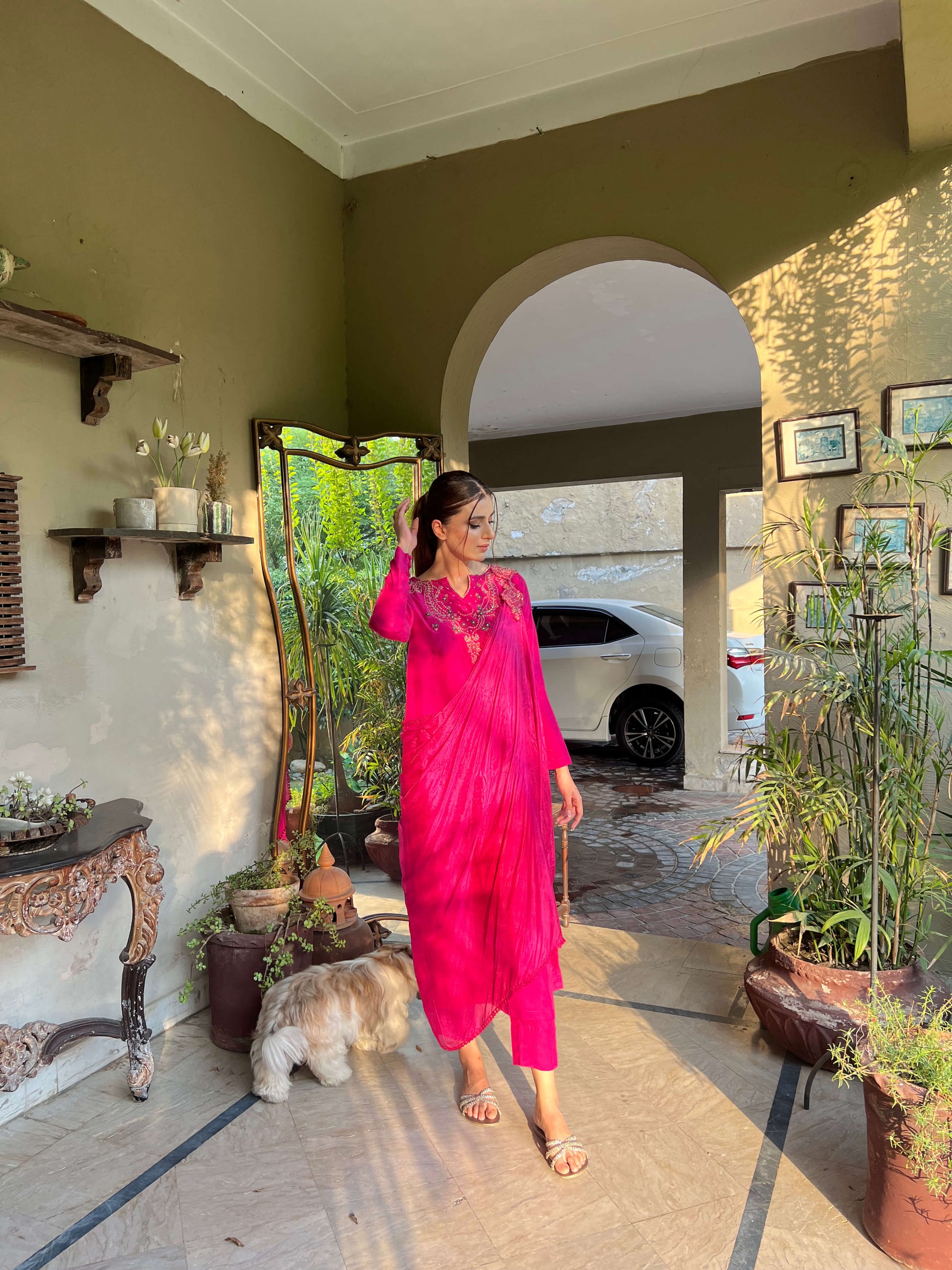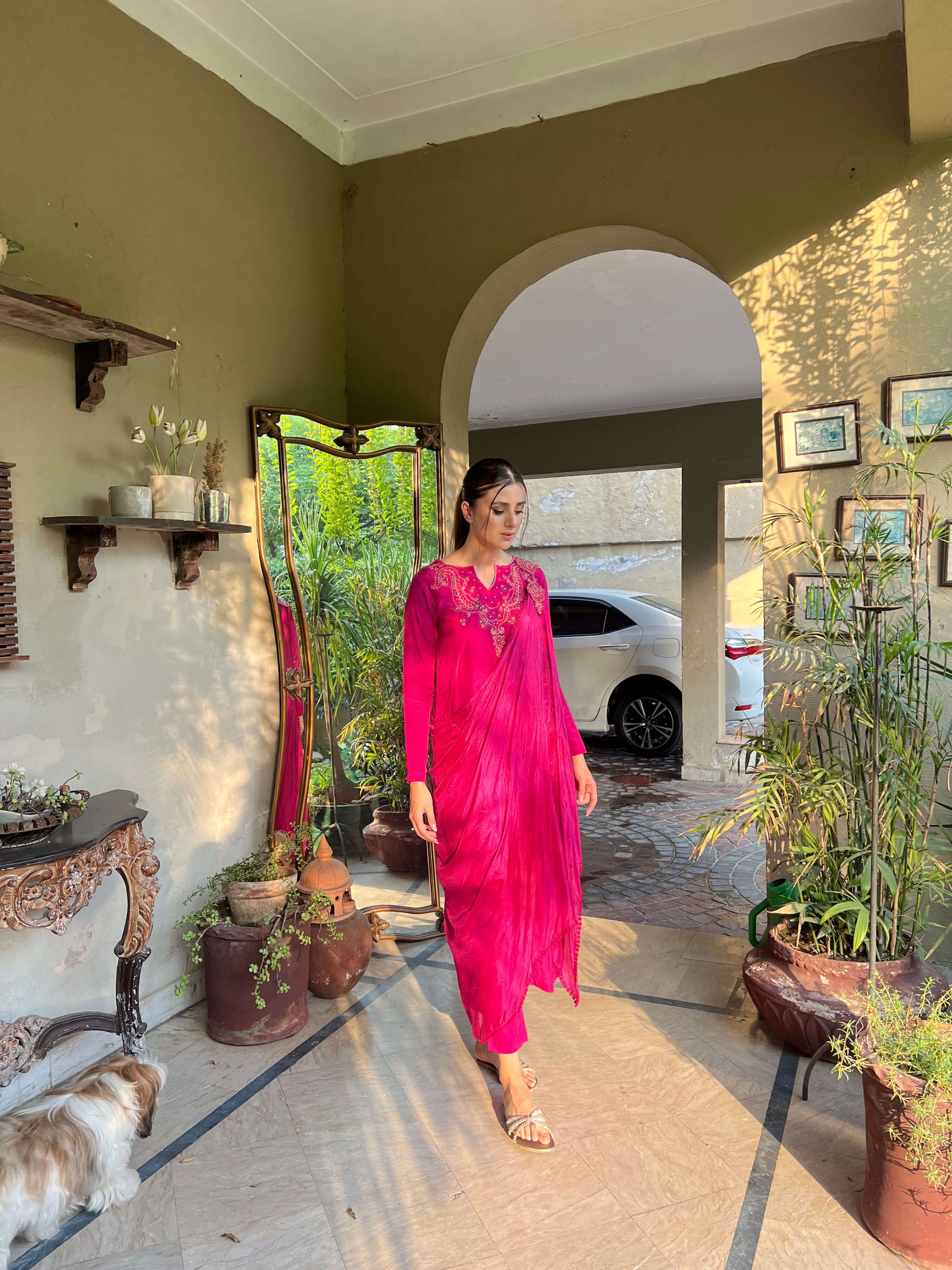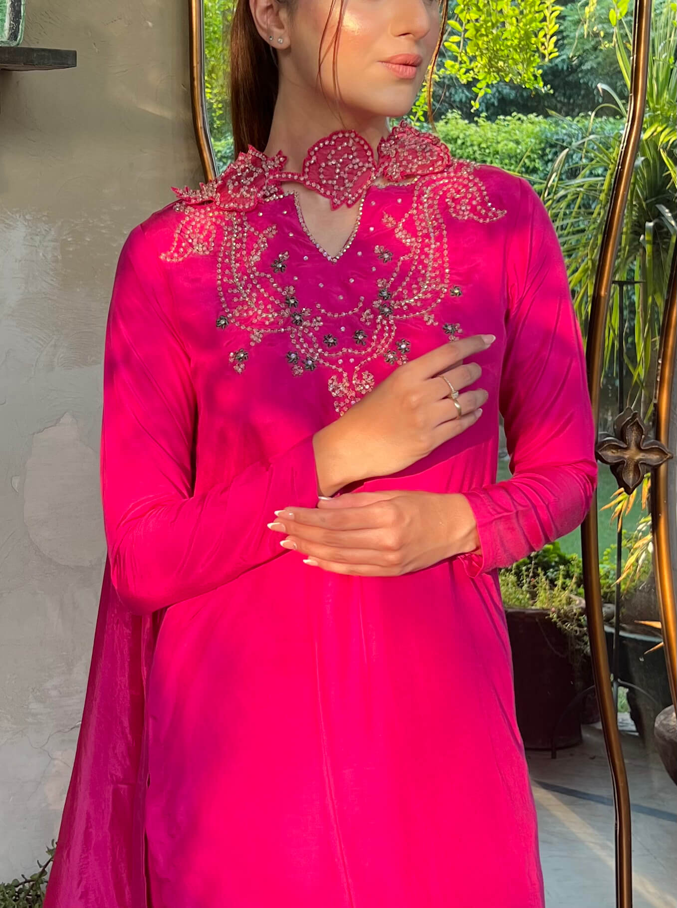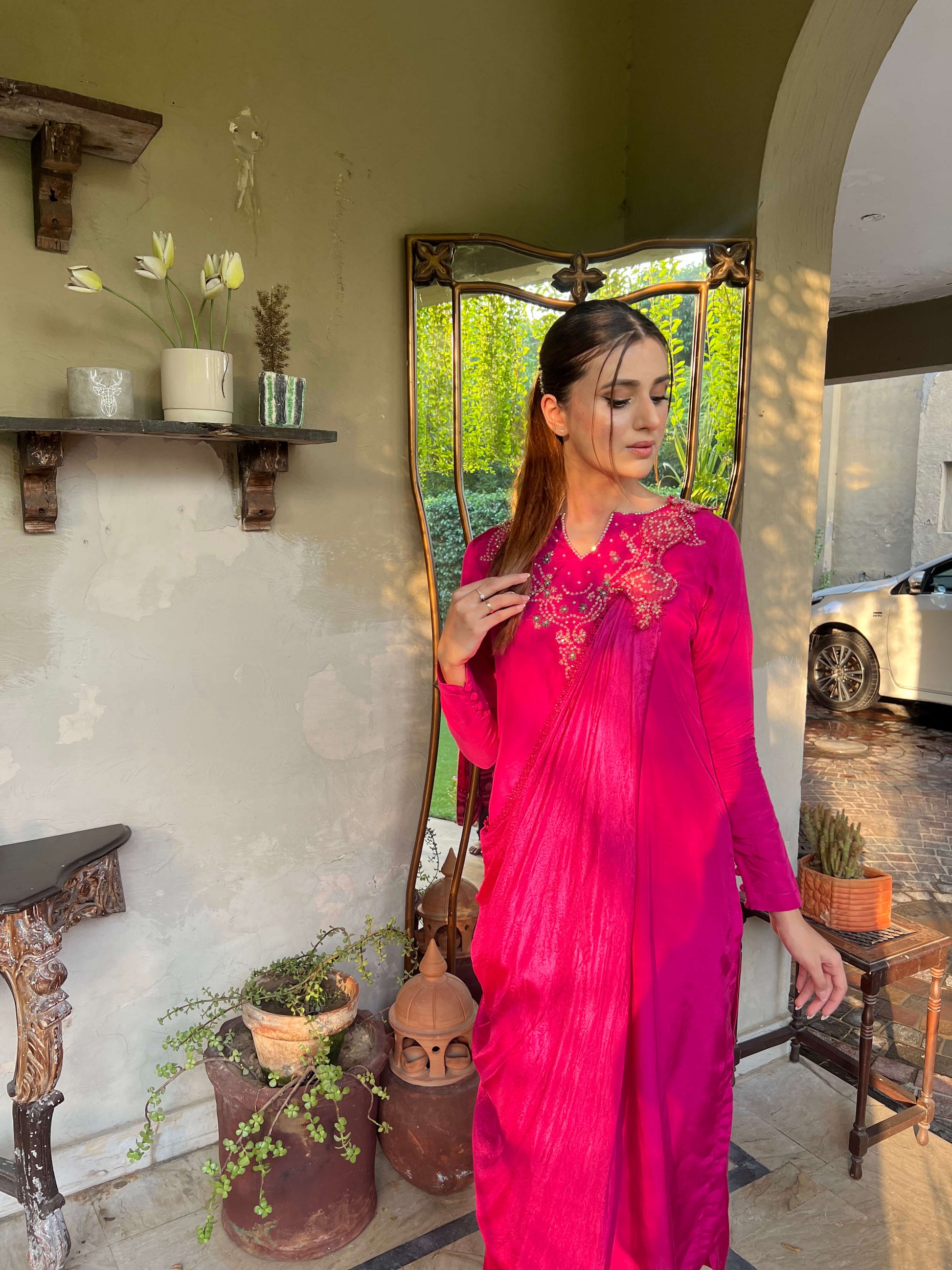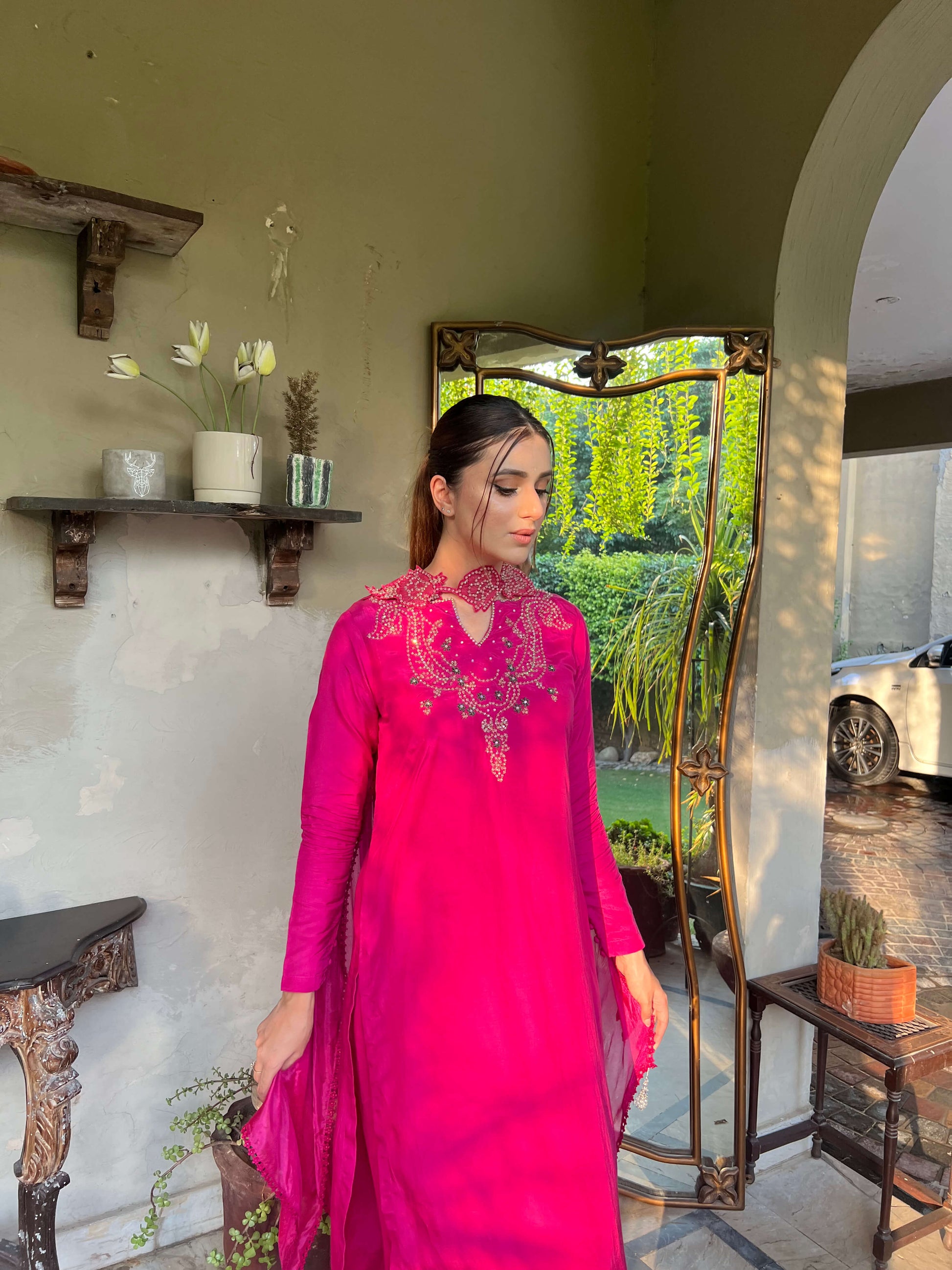 This elegant traditional ensemble features a soft pastel blush-pink long kameez adorned with delicate thread embroidery and beadwork. The embroidery, predominantly floral, cascades gracefully from the shoulder to the hem on one side, adding a subtle yet refined touch of glamour. The neckline and full-length sleeves enhance the sophisticated silhouette, while the fabric drapes fluidly, exuding grace and poise. This look is perfect for formal occasions like weddings, receptions, or festive gatherings.