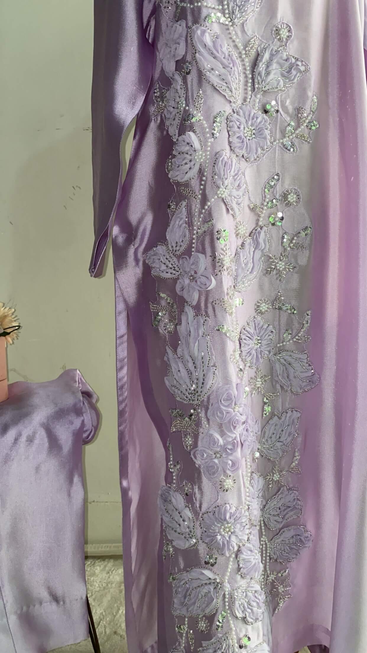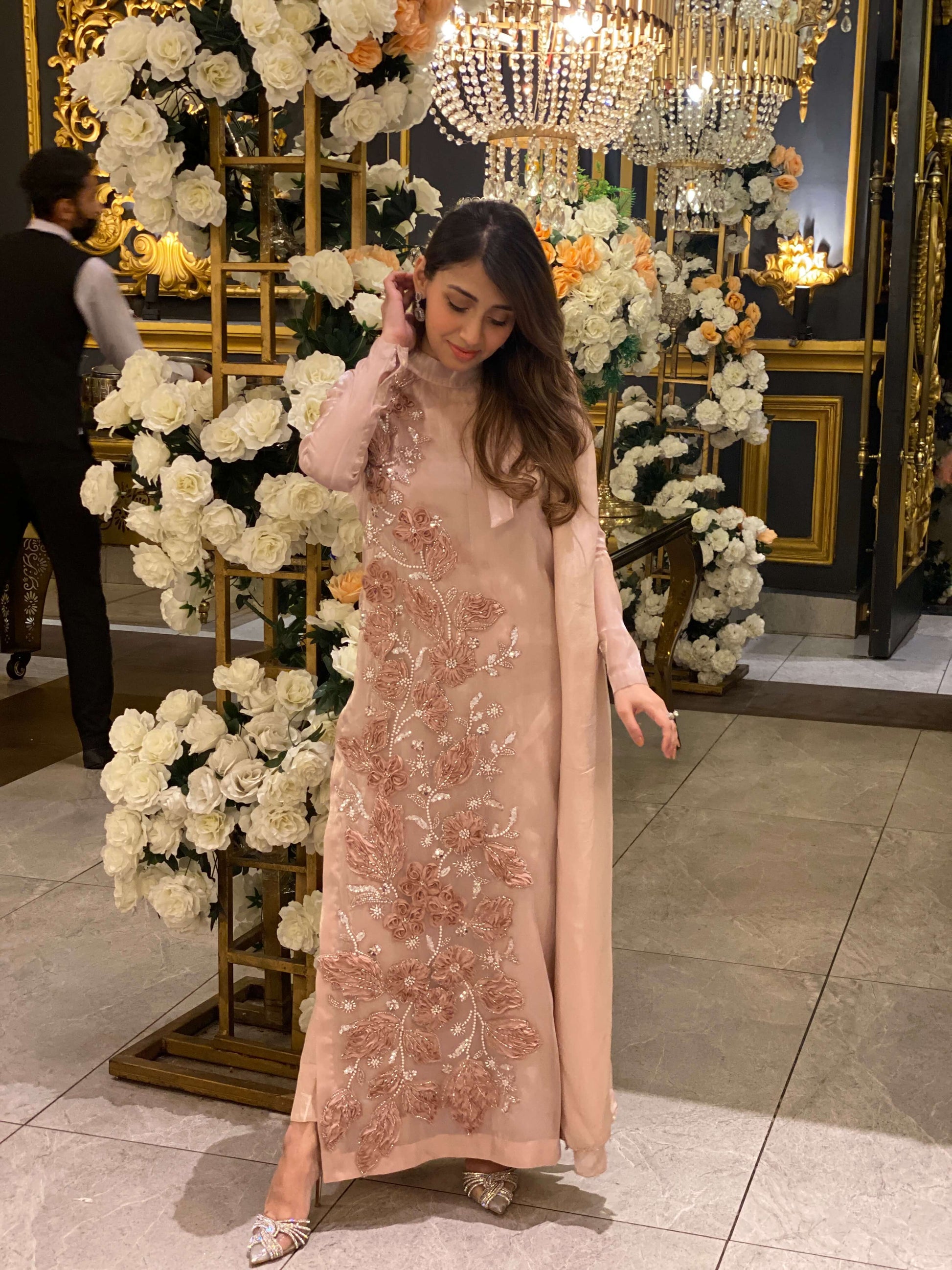 This elegant traditional ensemble features a soft pastel blush-pink long kameez adorned with delicate thread embroidery and beadwork. The embroidery, predominantly floral, cascades gracefully from the shoulder to the hem on one side, adding a subtle yet refined touch of glamour. The high neckline and full-length sleeves enhance the sophisticated silhouette, while the fabric drapes fluidly, exuding grace and poise. This look is perfect for formal occasions like weddings, receptions, or festive gatherings.