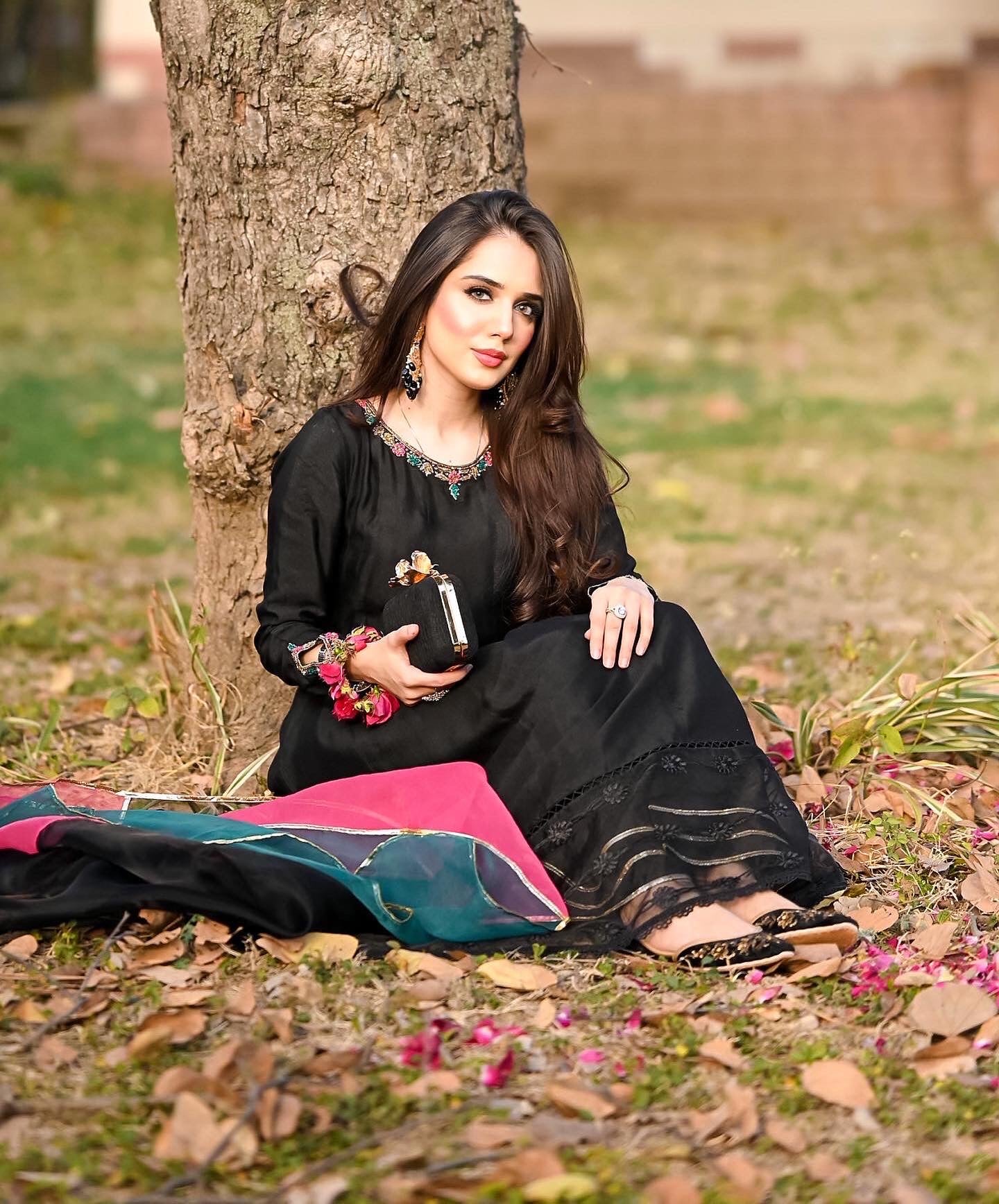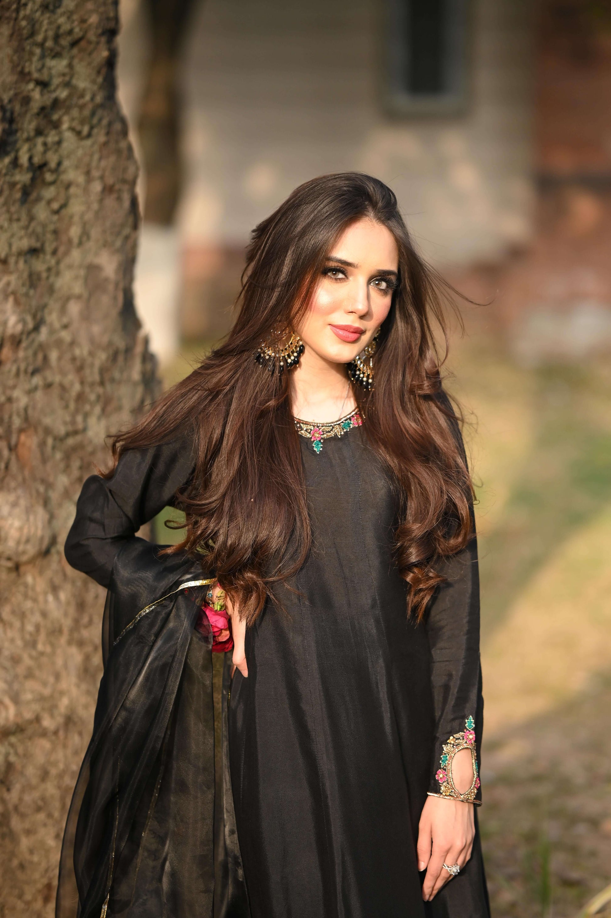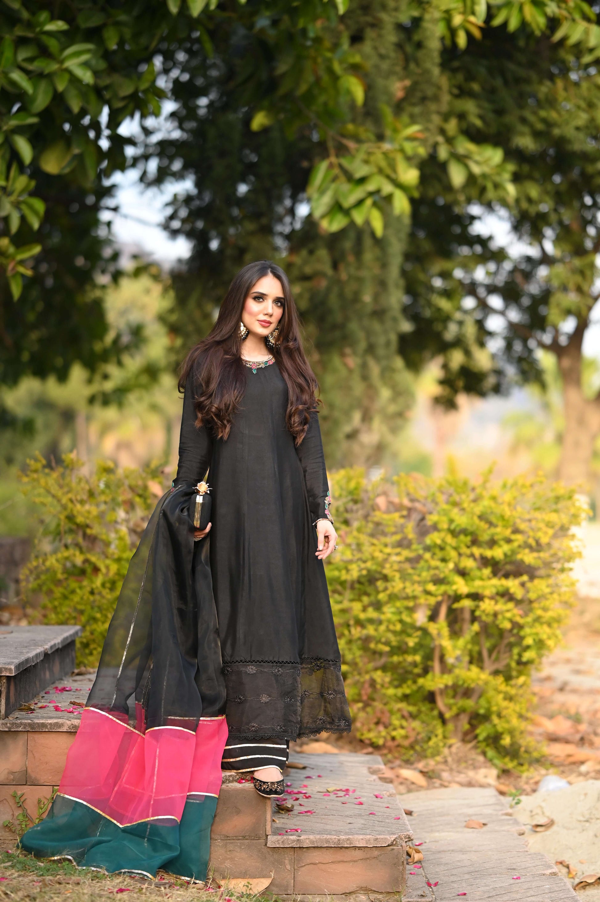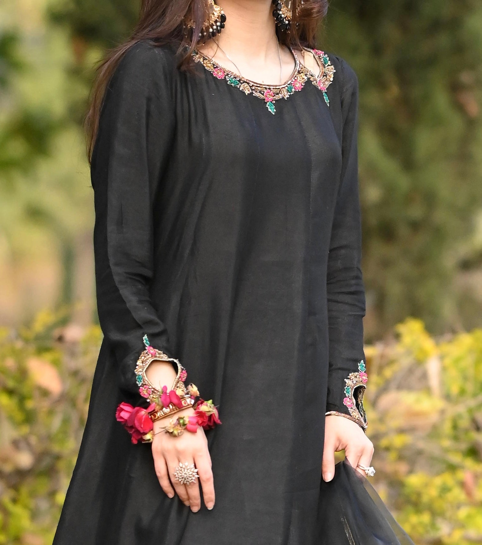 This elegant black three-piece attire features delicate floral hand embellished work on the neckline and sleeves, paired with a sheer organza dupatta edged in gota and contrast colour organza panels. And flaired sharara under the long dress. The soft, flowy fabric adds a graceful charm, making it a perfect choice for daytime gatherings and festive occasions.