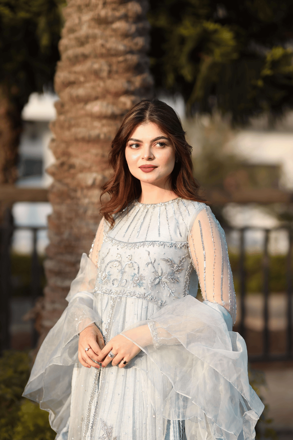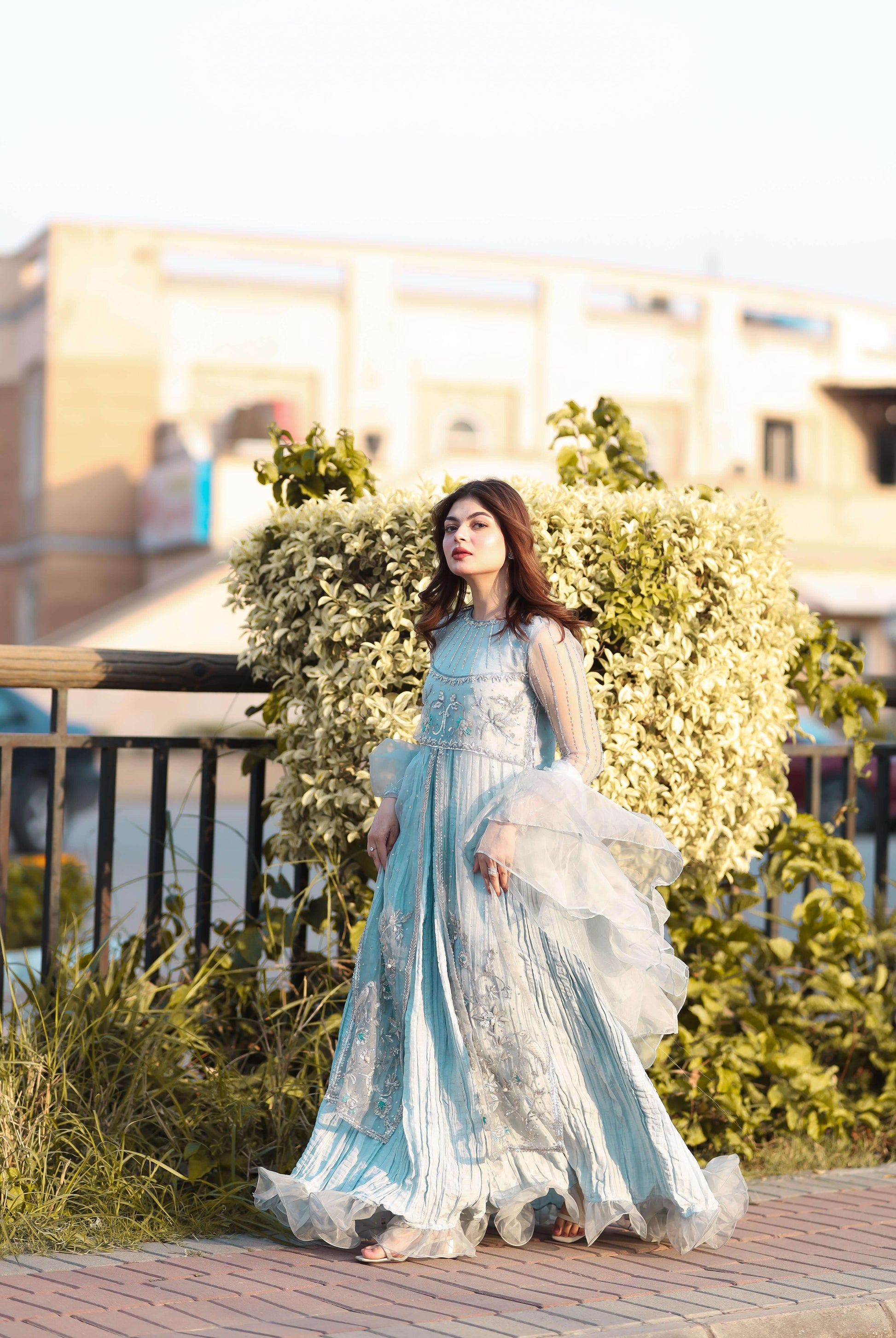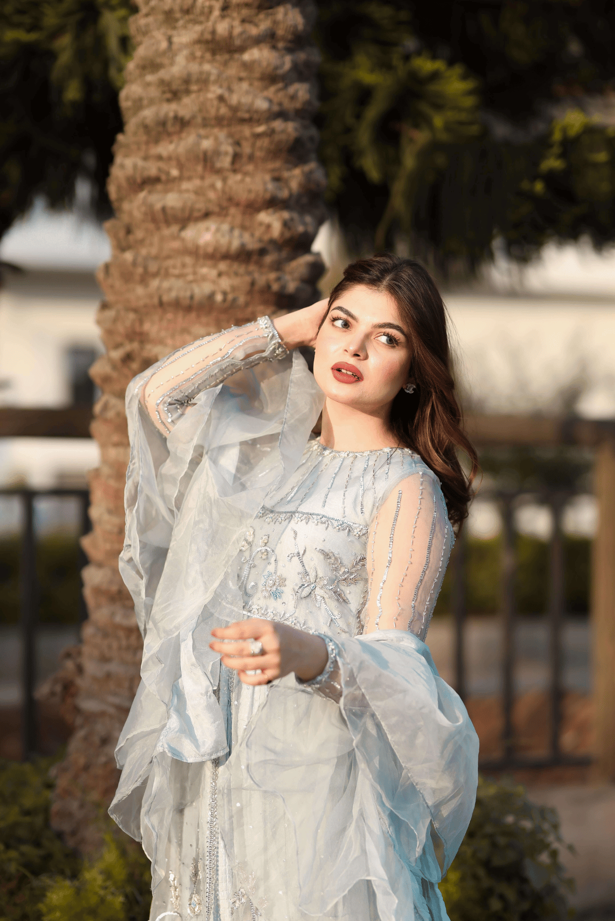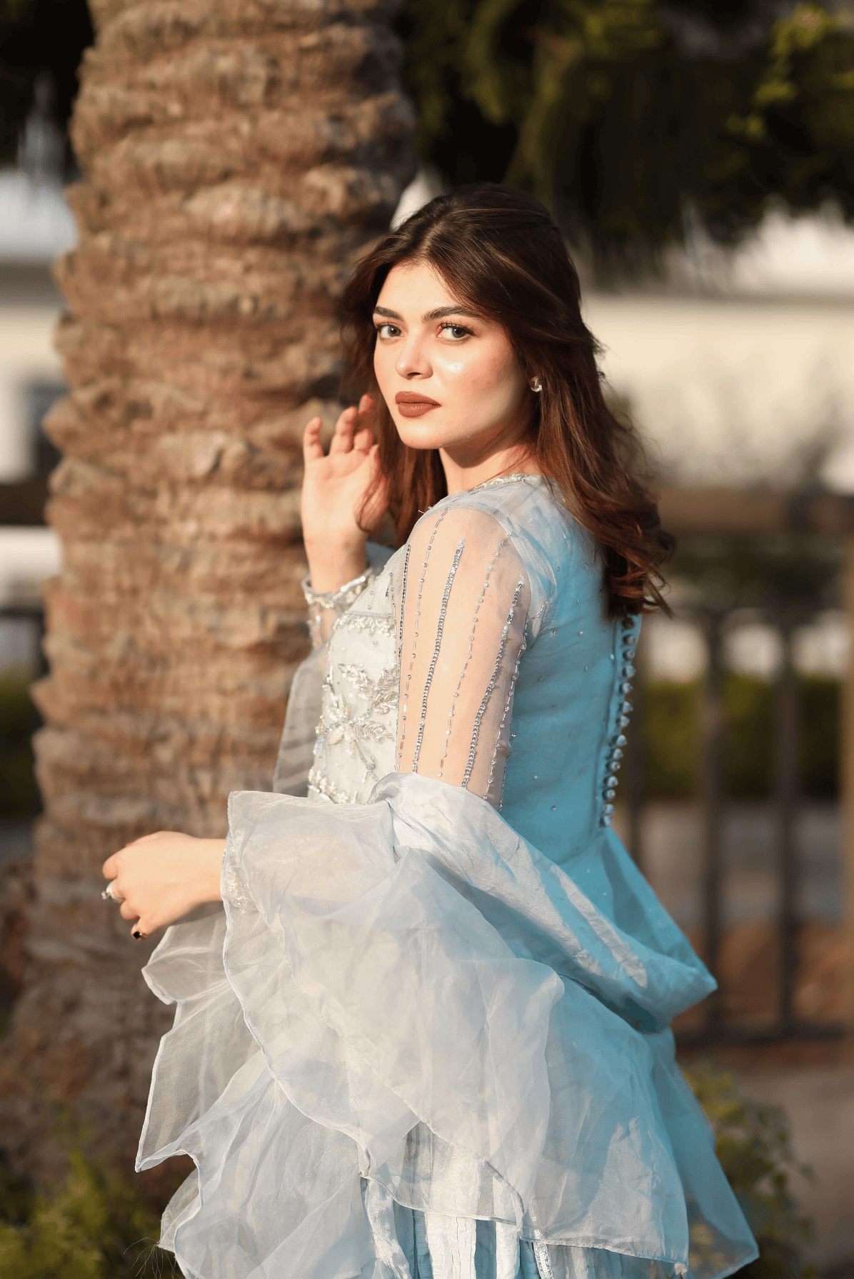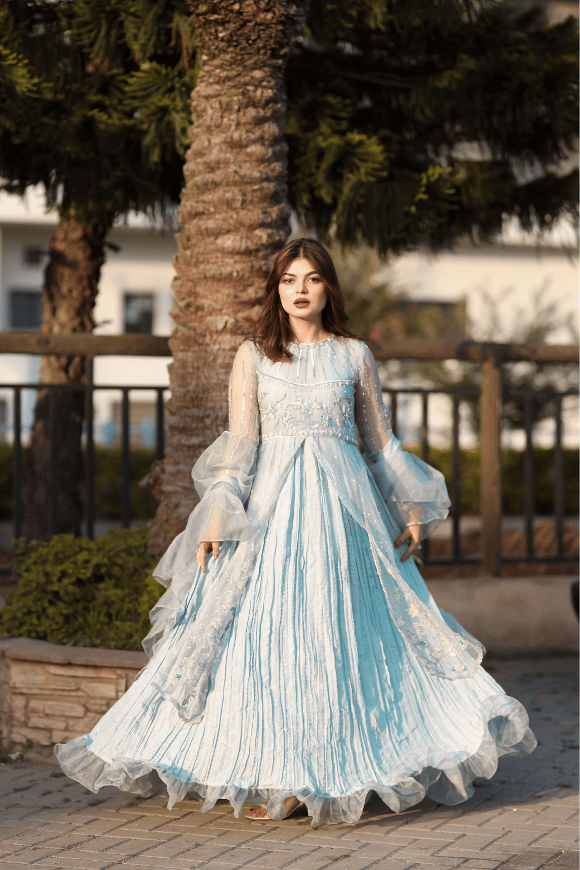 This dreamy ice blue silhouette is adorned using kora dabka, naqshi, pearls, sequences and crystals. Feature embellishments that takes shape of floral trellises. Layered over a crushed pishwas, and paired with the ruffle organza duppata. Pure fabric used. This dress is ideal for your upcoming festivities.