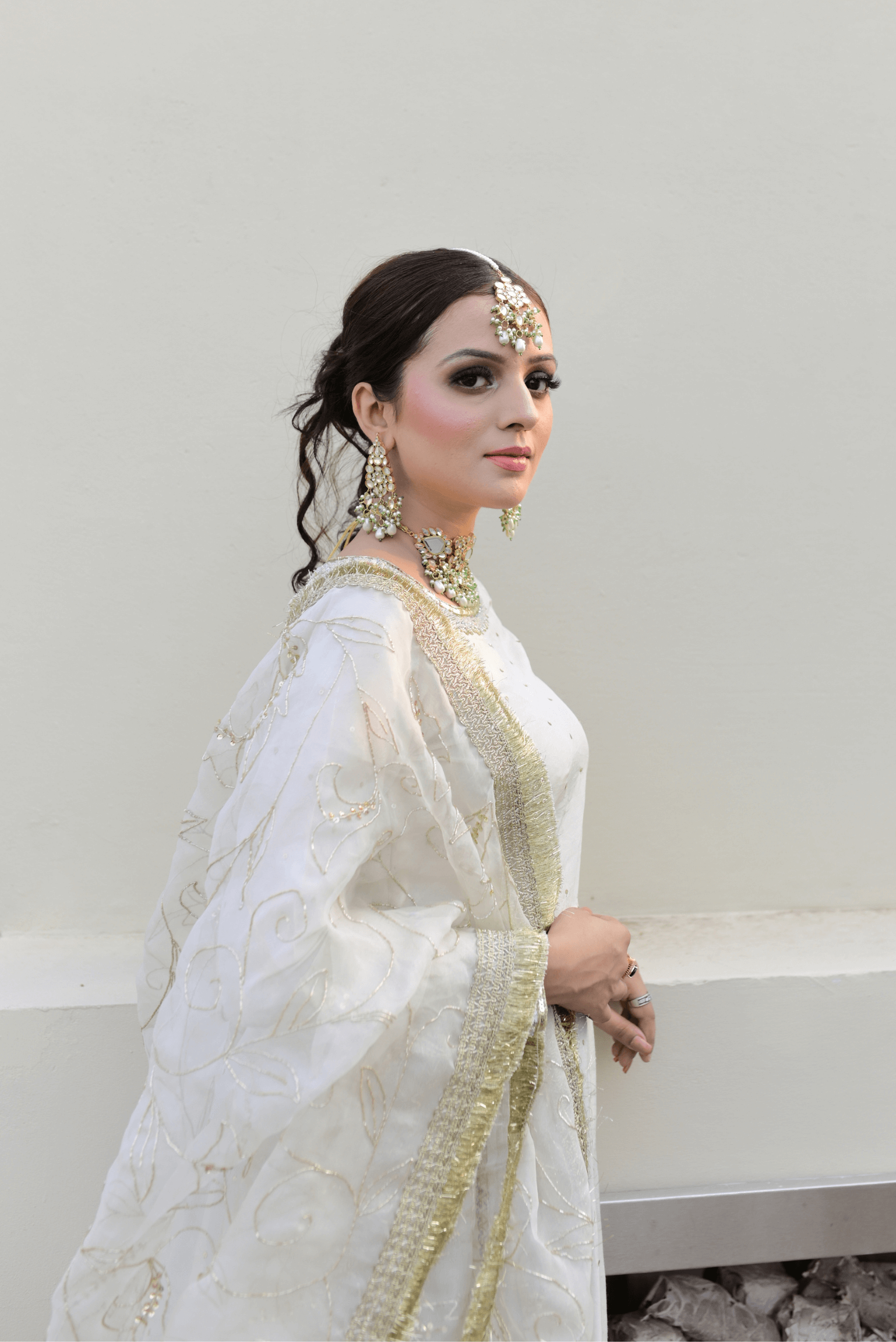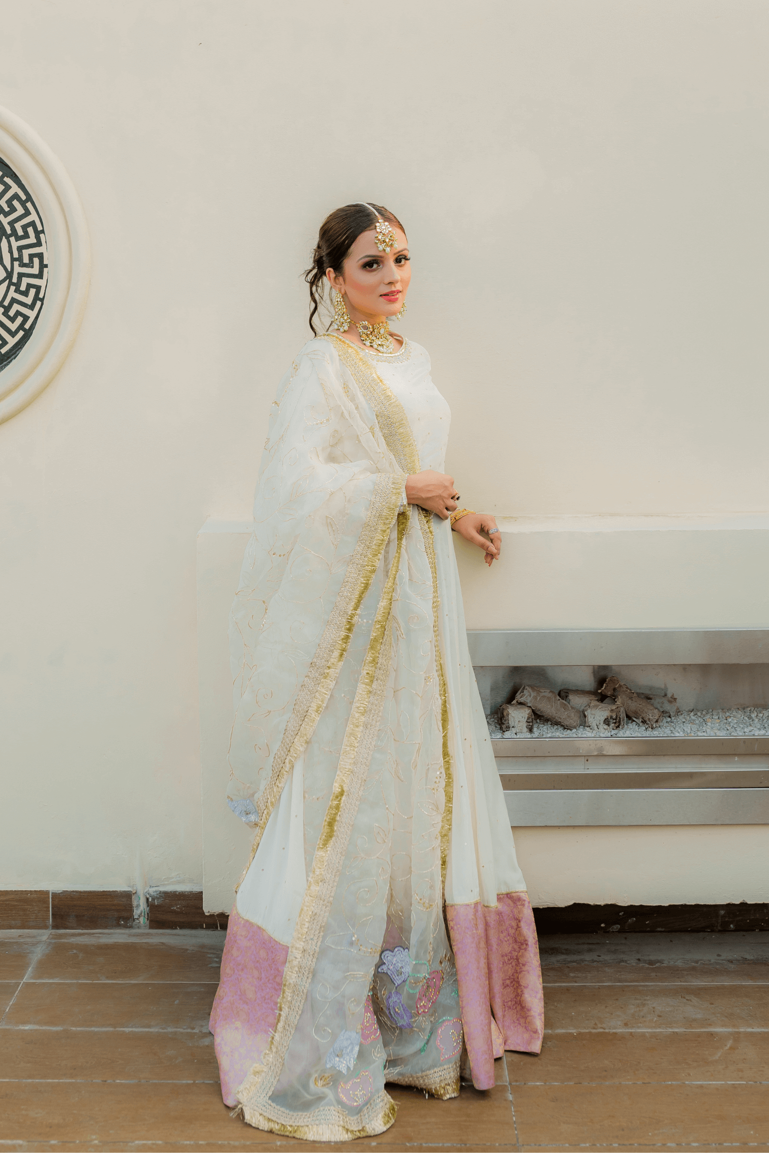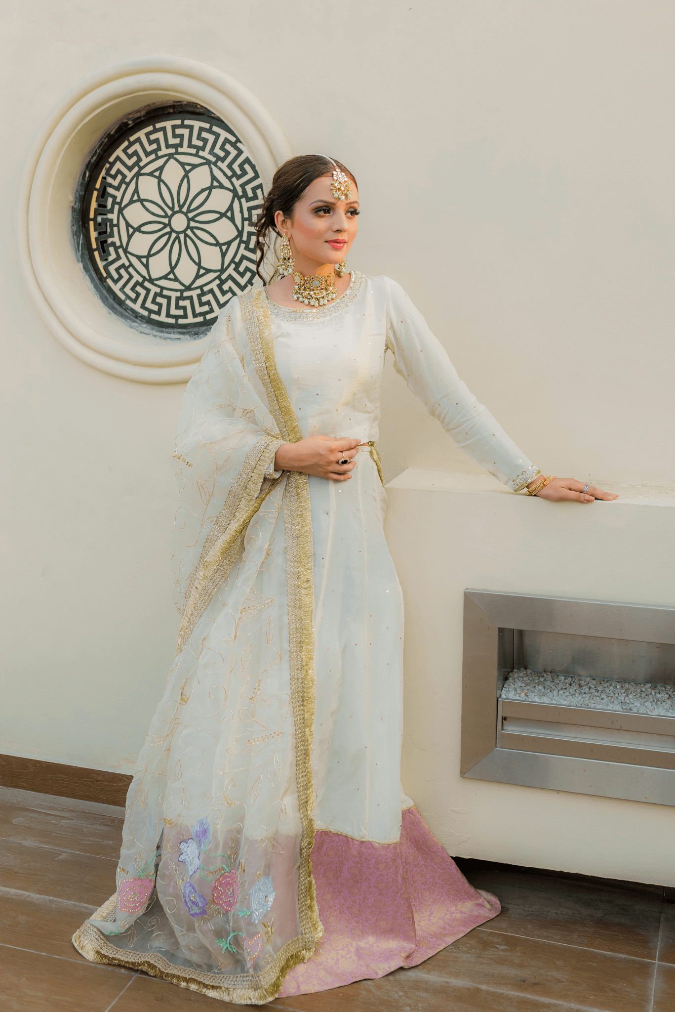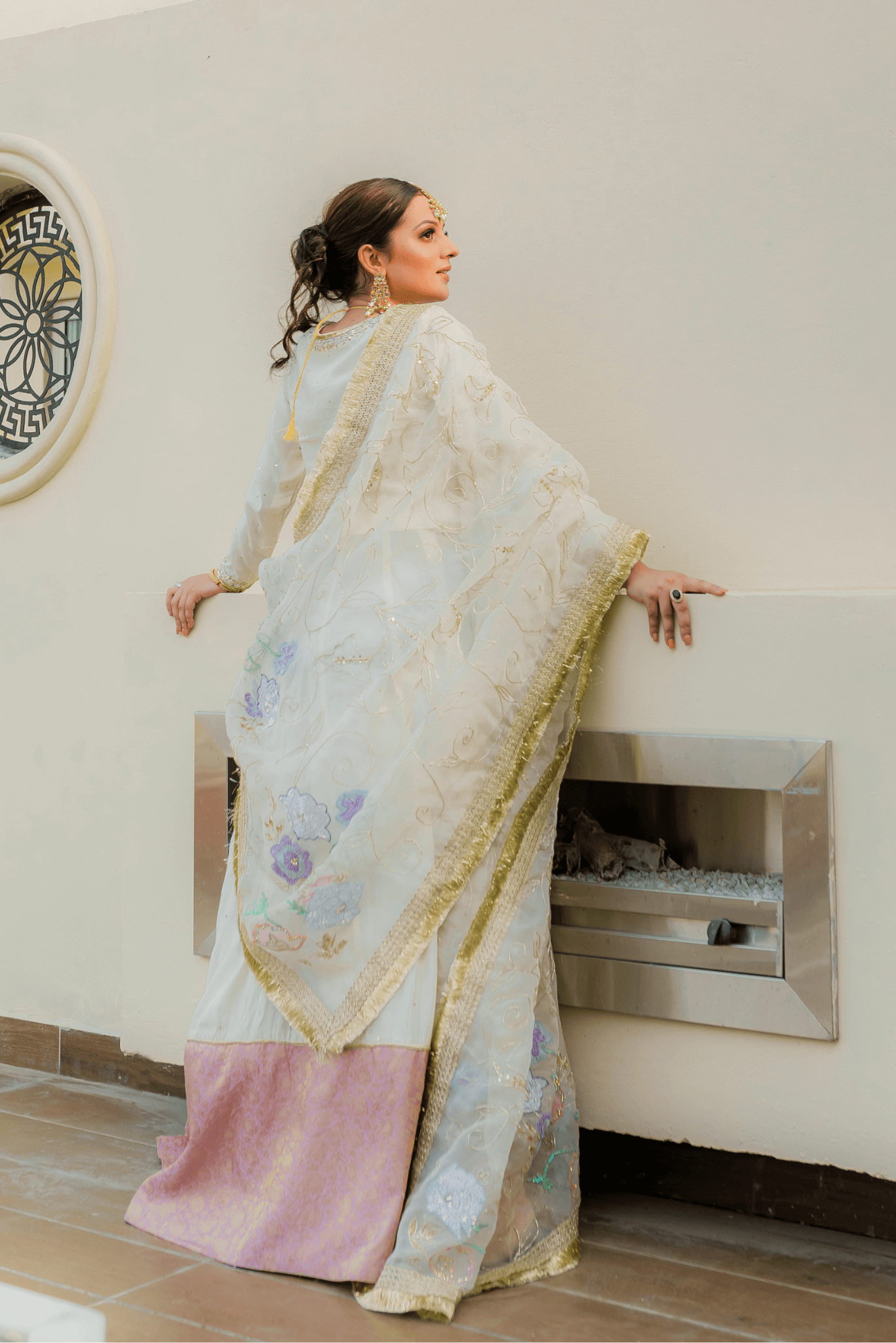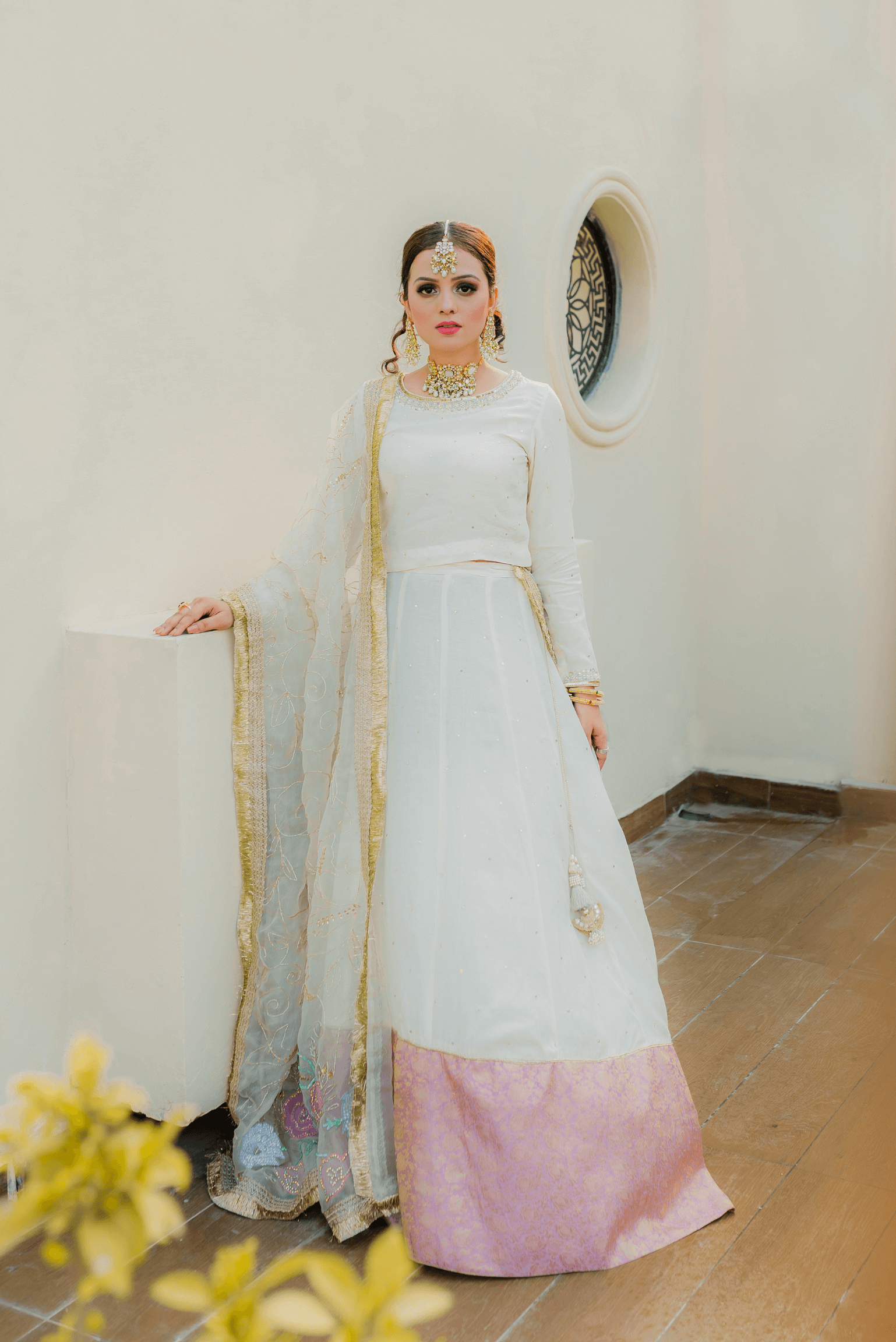 Blended beautifully into soulful tone of nature, Korean raw silk lehnga choli paired with pure organza duppata, featuring glistening embellishments zari, sequence, resham, crystals dabka and laces.