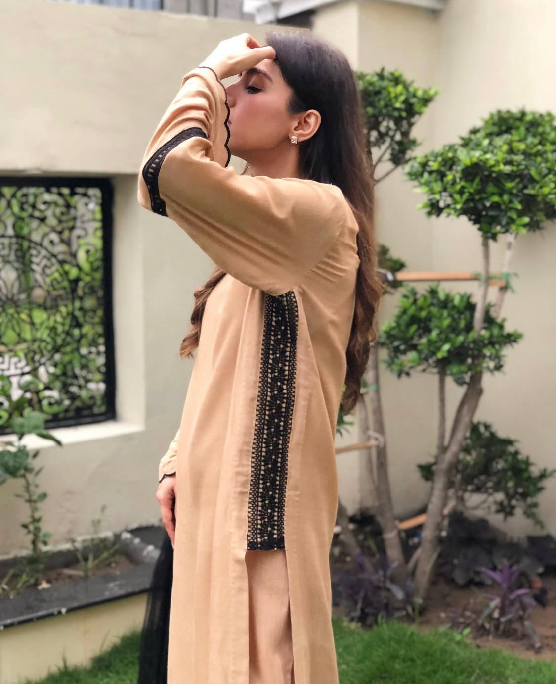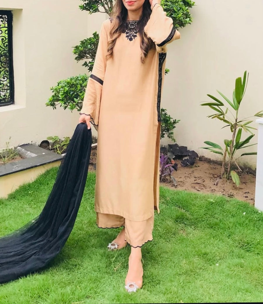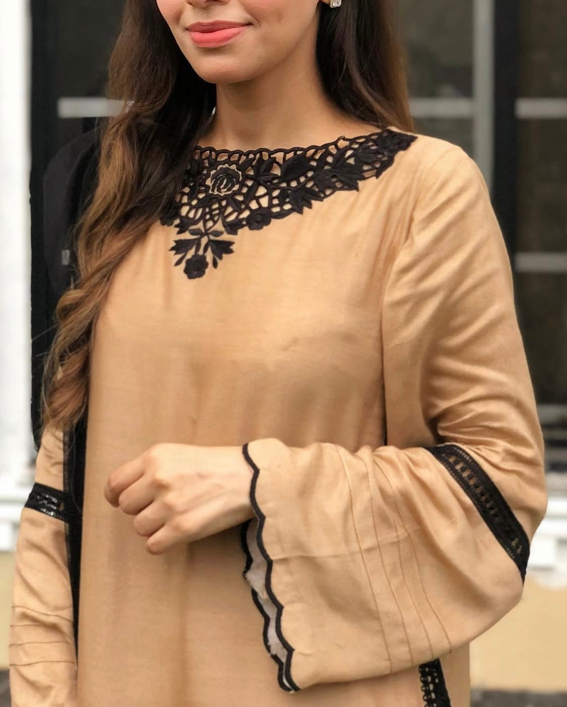 This outfit is elegant and traditional with modern touch, cutwork embroidery on neck and sides, and scallop on sleeves and edges on culotte. Perfect for the evening wear.